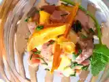 Frango marinado em tomate e lima, com tomate-cereja e halloumi