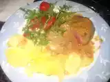 Bacalhau assado com feijão branco, tomate e bacon e batata assada