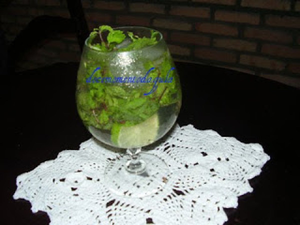 - Colocar o açucar , limão e os galinhos de hortelã, e apertar apenas as folhas para soltar o gosto.