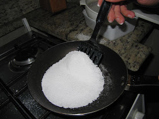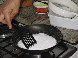 Coloque um pouco de sal na farinha antes de peneirar.Peneire um tanto, uma colher grande de farinha em cima da frgideira até formar uma fina camada, leve ao fogo, (não precisa nem untar) aguarde cerca de 30 segundos, depende da chama.