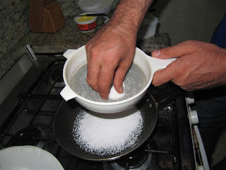 A receita está correta porém o modo de preparo está incompleto,da forma que se mostra acima,dá á entender que é só pegar a goma que normalmente encontramos seca,e só colocar na frigideira que vai dar certo,e não é,em algumas regiões como Amazônia se compra a massa já húmida,mais na maioria das regiões do país não.A goma deve ser umedecida com água até que apertando não se desmanche,depois passada na peneira,ou então colocada de molho com água até cobrir toda superfície,por pelo menos 3 horas,depois escorrida a água,seca com um pano limpo e passa na peneira,para quem não tem noção do ponto de umidade da massa,a segunda opção é melhor,depois de todo processo,aí sim segue o pap citado á cima.