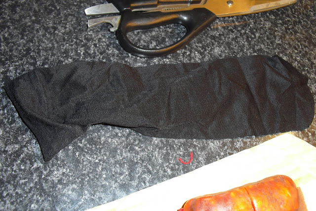 Os ingredientes do meio da lista, os que estão a negritocolocam-se dentro da meia e da-se um nó. Isto para que não fiquem espalhados no meio dos caracois porque sabe mal apanhar pedaços, e para não correr o risco de apanhar uma malagueta!!!