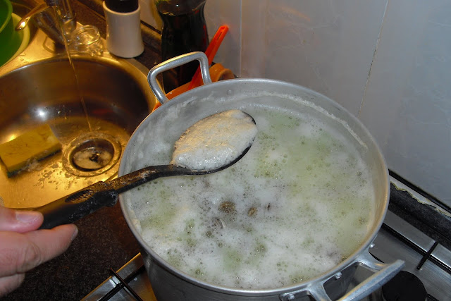 Logo que comece a formar esta espuma, deve baixar-se o lume e com uma colher ir retirando toda esta porcaria, sim porque esta espuma é a ranhoca deles, nhaccc nhaccc...