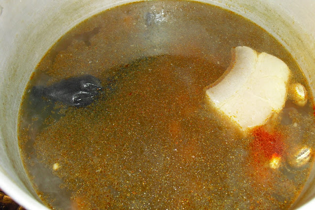 Quando a espuma já estiver toda ela retirada, junta-se a meia com os ingredientes,sal e piri-piri a gosto, o chouriço e o toucinho e coloca-se em lume médio.