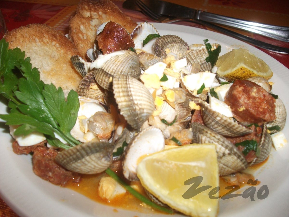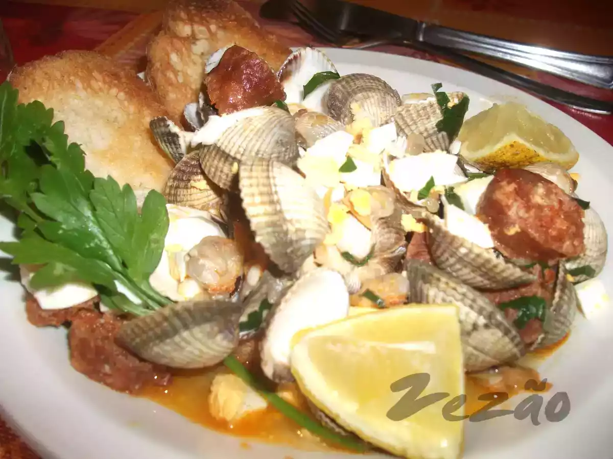 Cricos à zezão (berbigão) EntradaMédio1 h 45 m Enviar esta receita a um amigo Imprima esta página Falar com o autor da receita Fez esta receita? Compartilhe Ingredientes 4 500 gramas de berbigão (limpos de areia, preferencialmente em água do mar durante 2 horas antes de confeccioná-los) 1 tomate grande e maduro 4 dentes de alhos 1 chouriço vermelho (preferencialmente picante) 1 Copo de vinho branco 1 limão 1 ovo cozido Coentros que baste Azeite que baste Fatias de pão saloio torradas