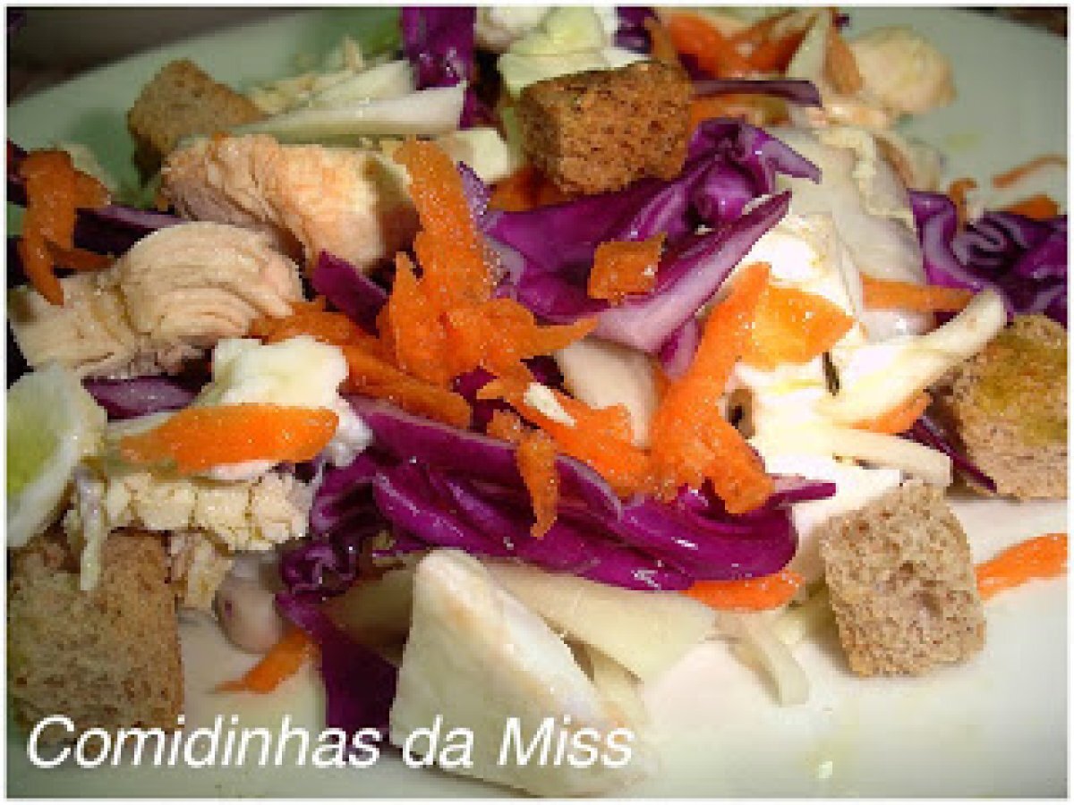 Salada com frango, mozzarella e croutons EntradaMuito Fácil15 min2466 Kcal Enviar esta receita a um amigo Imprima esta página Falar com o autor da receita Fez esta receita? Compartilhe Ingredientes 1 Croutons de pão integral Mozzarella Couve roxa ripada Repolho ripado Peito de frango cozido e desfiado Cenoura ralada Molho: 6 colheres de sopa de azeite 1 colher de chá de mostarda Ervas aromáticas Pimenta ralada da hora Custo estimado: 10.59Euros€ (10.59€/porção)