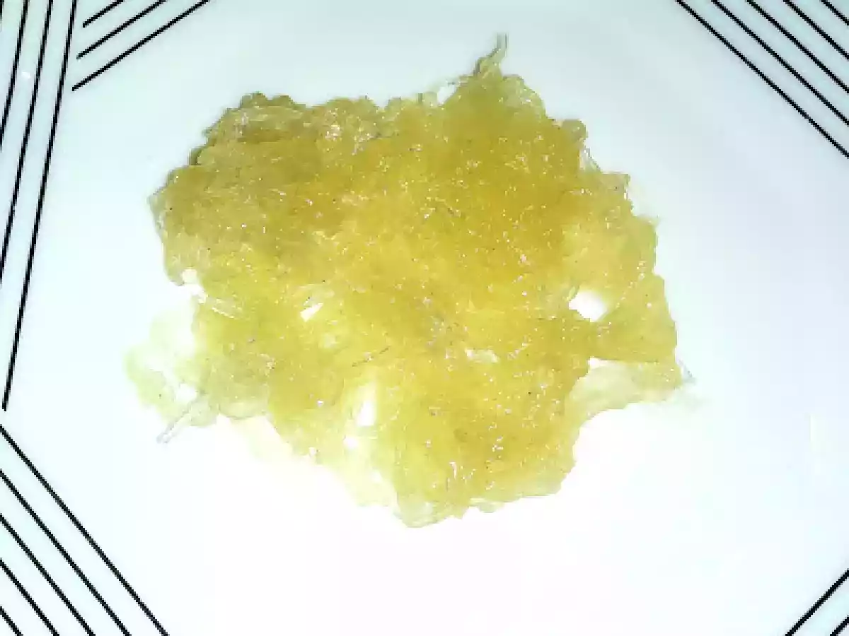 7- Com a ajuda de uma colher ou espátula raspar a polpa da chila agarrada à casca. - 8- Separar com as mãos (ou com ajuda de um garfo) os fios da chila que estejam ainda agrupados. Deixar escorrer bem a água.