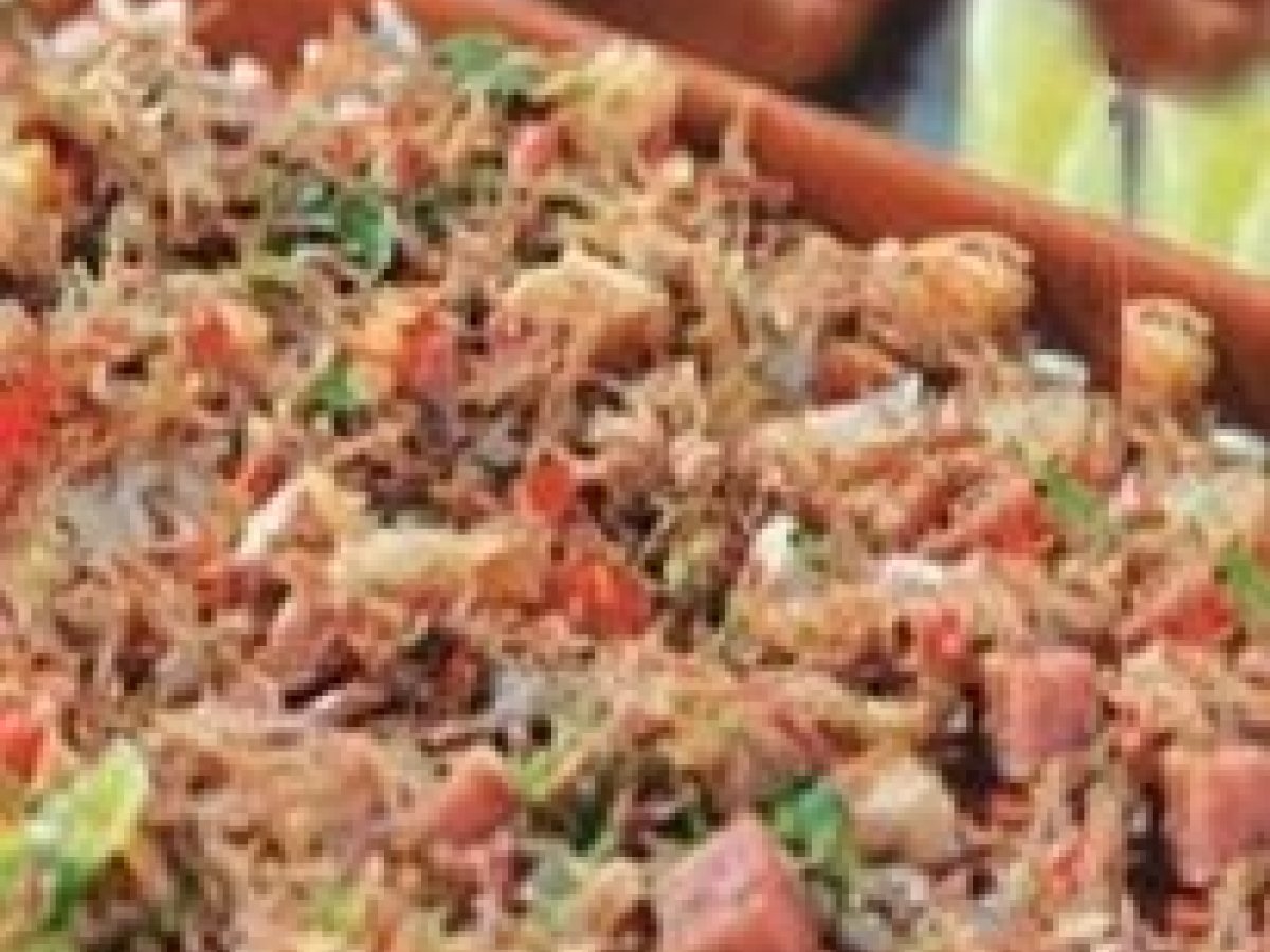 Lave bem o arroz e escorra Pique bem as sobras do churrasco Refogue, como de costume, a cebola e o alho em óleo quente Quando a cebola ficar transparente,