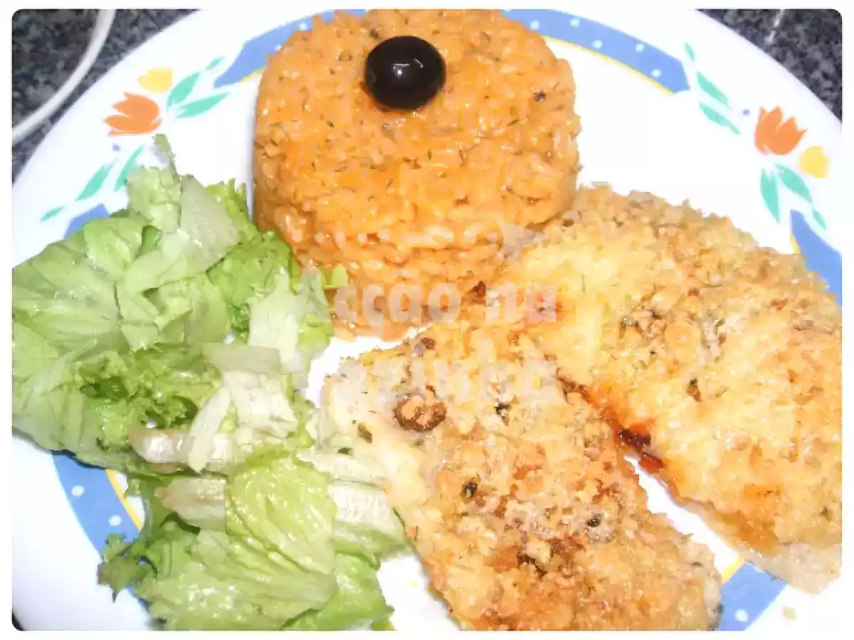 Arroz de tomate com filetes pescada no forno AnteriorNext Prato PrincipalMuito Fácil50 min Enviar esta receita a um amigo Imprima esta página Falar com o autor da receita Fez esta receita? Compartilhe Ingredientes 4 2 chávenas de arroz 6 chávenas de água 1/2 cebola 1 dente de alho sal 1 fio de azeite 1 caldo maggi de galinha Polpa de tomate Ervas de provence Endro Filetes de pescada Sal e pimenta branca Sumo de limão q.b. Leite q.b. Pão ralado aromatizdon com alho, salsa e endro Endro Ervas de provence Manteiga derretida Pimentão doce