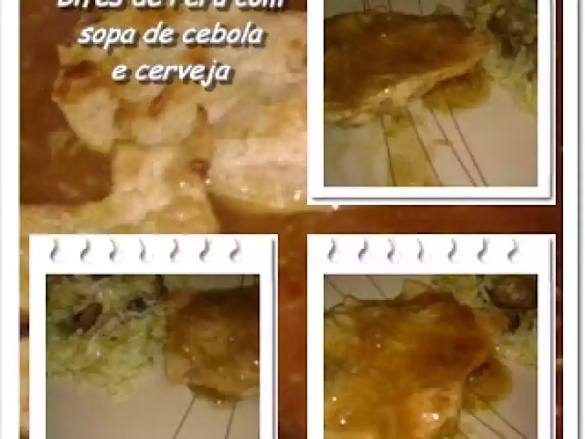 Bifes de perú com sopa de cebola e cerveja Prato PrincipalMuito Fácil45 min110 Kcal Enviar esta receita a um amigo Imprima esta página Falar com o autor da receita Fez esta receita? Compartilhe Ingredientes 2 bifes de perú 1 pacote de sopa de cebola 1 cerveja pimenta preta q.b. Custo estimado: 1.88Euros€ (0.94€/porção)