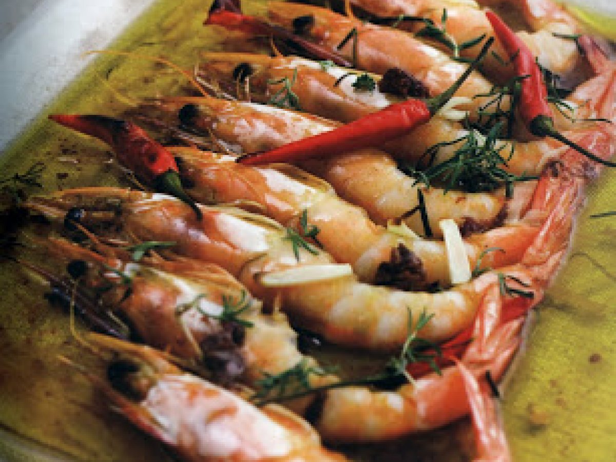 Camarão confitado com anchovas e hortelã-da-ribeira Prato PrincipalMuito Fácil20 min Enviar esta receita a um amigo Imprima esta página Falar com o autor da receita Fez esta receita? Compartilhe Ingredientes 6 2,5 k de camarão descascado com cabeça 21/30 3 dentes de alho laminados 5 anchovas picadas Malaguetas vermelhas frescas q.b. 1,5 dl de azeite virgem Sumo de 1 limão Sal marinho tradicional q.b. 1 colher (chá) de pimenta preta em grão 2 folhas de hortelã-da-ribeira 15 g de tomate seco picado