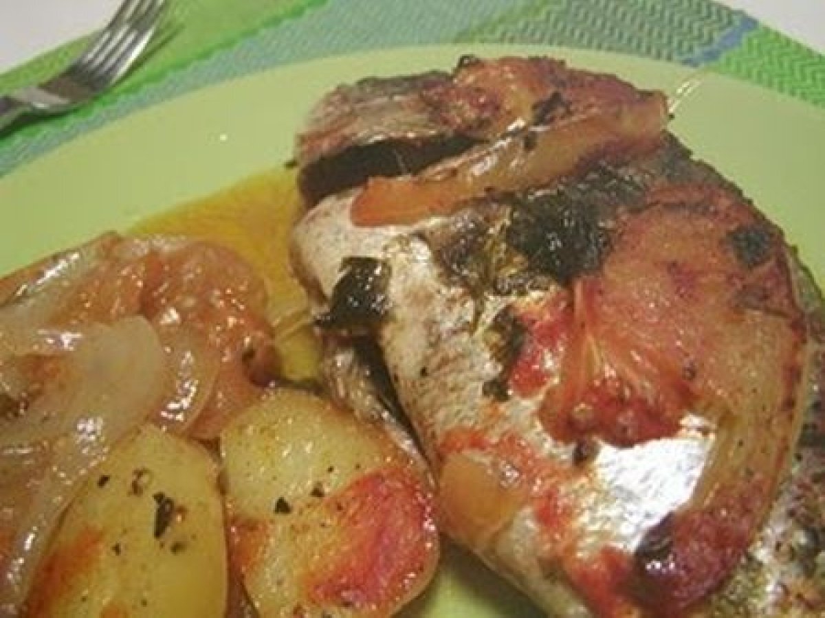 Dourada assada à portuguesa Prato PrincipalMuito Fácil45 min Enviar esta receita a um amigo Imprima esta página Falar com o autor da receita Fez esta receita? Compartilhe Ingredientes 2 para 2 pessoas: 2 douradas limpas 1 cebola 2 tomates maduros 2 dentes de alho 300gr de batatinhas novas 1 folha de louro azeite sal e pimenta 100ml de vinho Branco 1 raminho de coentros colorau