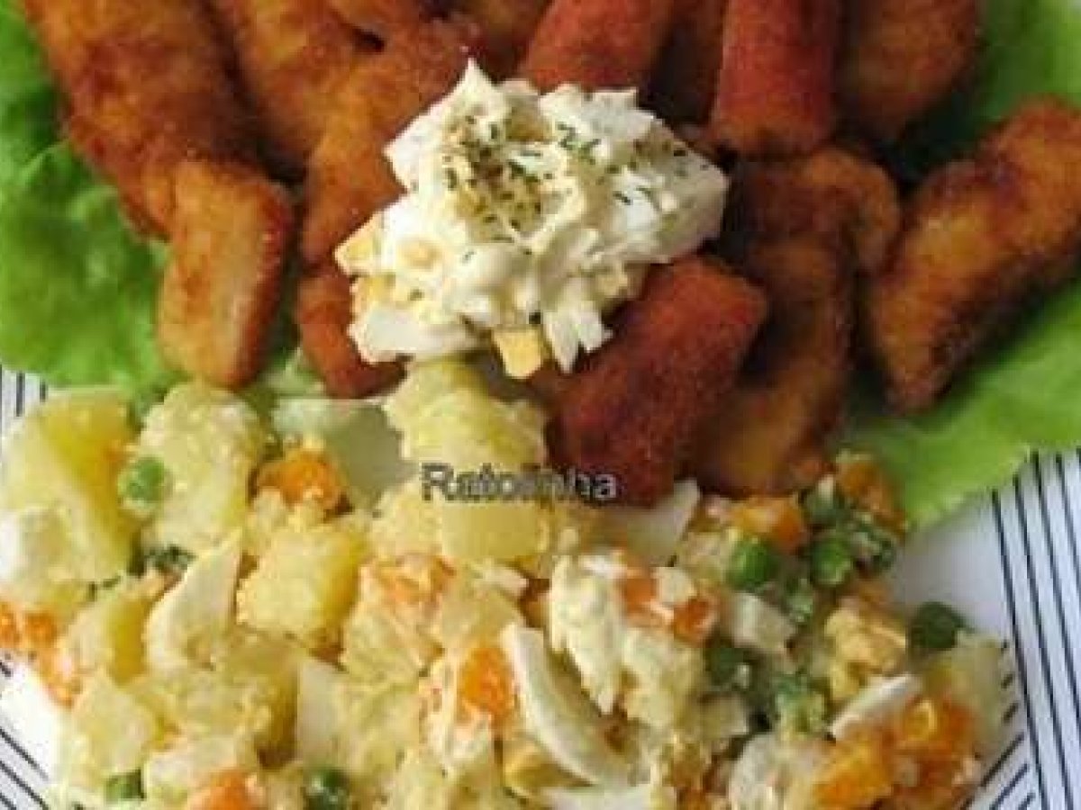 Douradinhos com molho tártaro Prato PrincipalMédio40 min Enviar esta receita a um amigo Imprima esta página Falar com o autor da receita Fez esta receita? Compartilhe Ingredientes 3 0,5 kg de filetes de peixe 8 delicias do mar sal, pimenta e sumo de limão Farinha, ovo batido, pão ralado Maionese, pickles e ovos cozidos