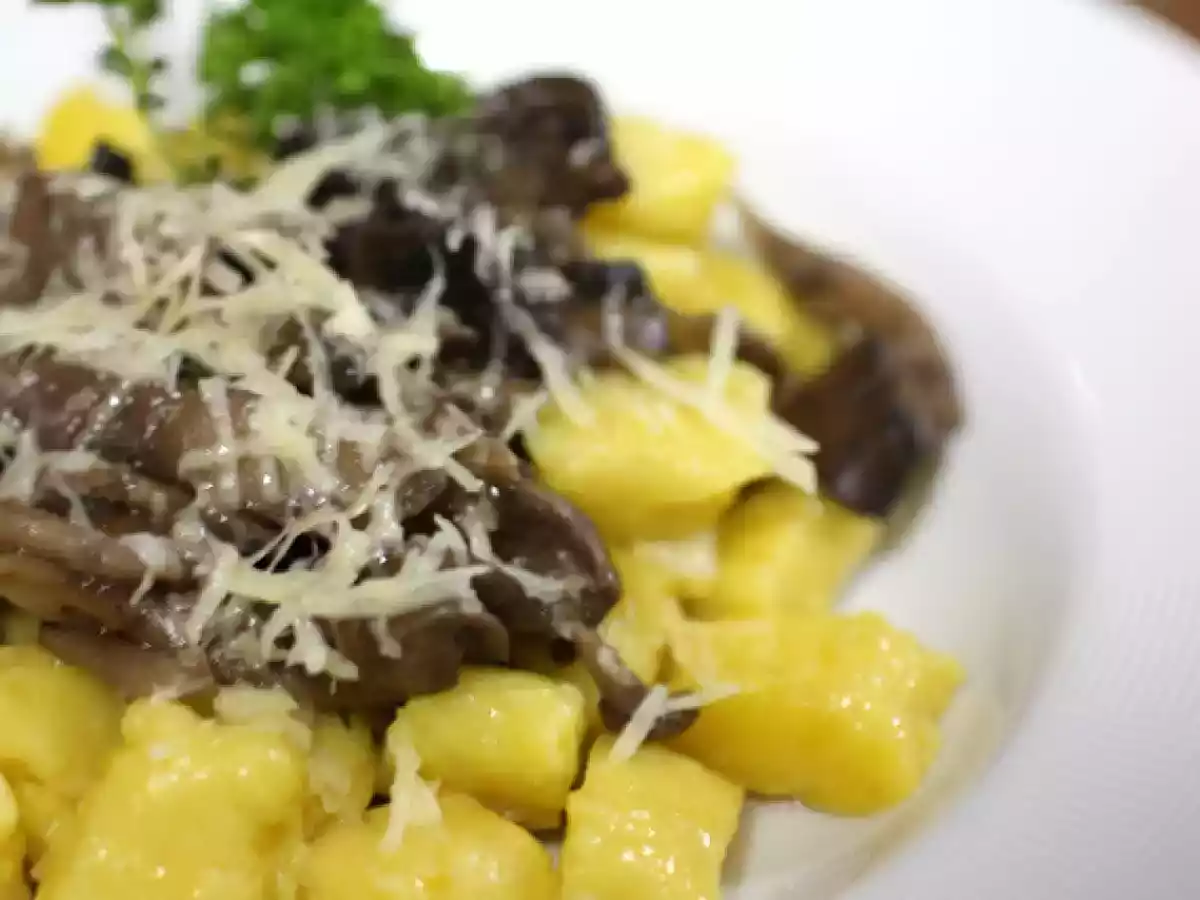 Gnocchi de baroa com ragu de cogumelos e vinho tinto Prato PrincipalMuito Fácil45 min410 Kcal Enviar esta receita a um amigo Imprima esta página Falar com o autor da receita Fez esta receita? Compartilhe Ingredientes 6 1 kg de batata baroa cozida e espremida 6 gemas 120 g de farinha de trigo 1 xícara de queijo parmesão ralado Sal e pimenta do reino a gosto Noz Moscada a gosto 500 g de cogumelos frescos Azeite de oliva 1 colher de manteiga 1 cebola pequena cortada em pequenos cubinhos 1 dente de alho 1 xícara de vinho tinto Caldo de carne a gosto Sal e pimenta do reino a gosto Tomilho fresco a gosto