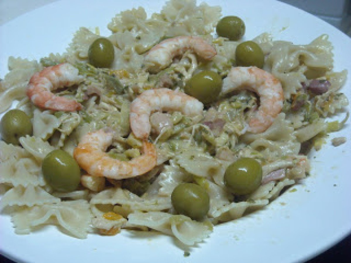 Lacinhos com camarão e azeitonas vote agora Prato PrincipalMuito Fácil25 min Enviar esta receita a um amigo Imprima esta página Falar com o autor da receita Fez esta receita? Compartilhe Ingredientes 3 lacinhos ou outro tipo de massa q.b. 1 cebola picada1 lata de milho doce das pequeninas 1 bacon aos pedaços q.b. pedaços de fiambre de peru 1 pacote de natas pequeno uns quantos camarões já cozidos e descascados azeite q.b. sal e pimenta azeitonas verdes