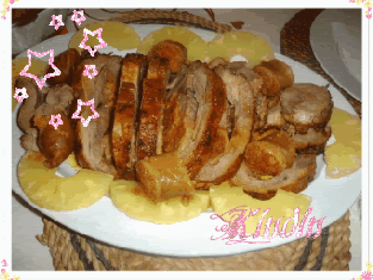 Lombo de porco recheado com farinheira Prato PrincipalMuito Fácil2 h 30 m Enviar esta receita a um amigo Imprima esta página Falar com o autor da receita Fez esta receita? Compartilhe Ingredientes 6 1 lombo de porco 2 farinheiras 4/5 fatias de queijo 3 dentes de alho 1 caldo de carne sal, pimenta e nós moscada q.b oregãos colorau azeite q.b 50 ml vinho branco 1 cebola grande polpa de tomate rodelas de ananáz 2 folhas de louro Fio para amarrar o lombo