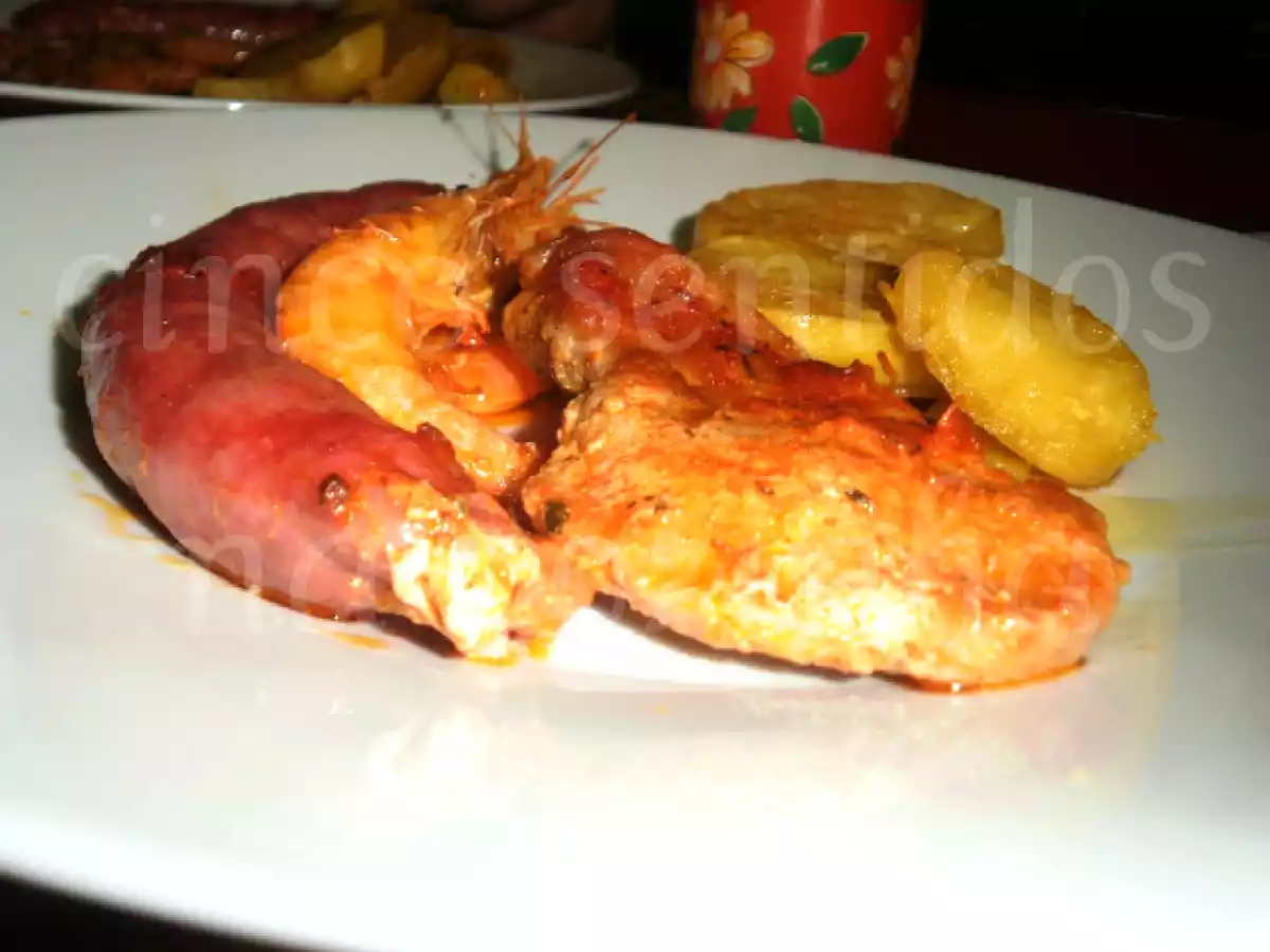 Mista de bifanas, salsichas e camarão no forno com batata assada AnteriorNext Prato PrincipalMuito Fácil1 h 20 m939 Kcal Enviar esta receita a um amigo Imprima esta página Falar com o autor da receita Fez esta receita? Compartilhe Ingredientes 3 3 bifanas de porco 3 salsichas frescas 150 g camarão 1 colher sopa de massa de pimentão 200 ml de vinho branco azeite 6 batatas médias sal azeite Custo estimado: 8.5Euros€ (2.83€/porção)