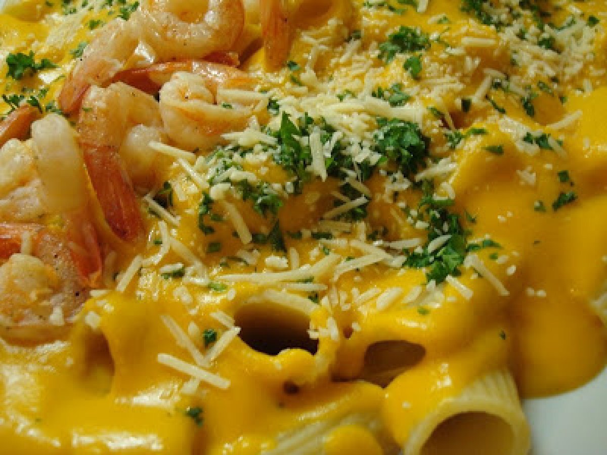 Rigatoni com creme de abobora e camaroes(alessandra) Prato PrincipalMuito Fácil30 min Enviar esta receita a um amigo Imprima esta página Falar com o autor da receita Fez esta receita? Compartilhe Ingredientes 6 3 colheres de azeite+3 colheres de azeite 1 abobora em cubos pequenos 2 dentes de alho sal pimenta do reino 1 xicara de agua 1 caldo de legumes 500 gramas de macarrao rigatoni 500 gramas de camarao 3/4 xicara de leite 1/2 xicara de manjericao picadinho queijo parmesao ralado