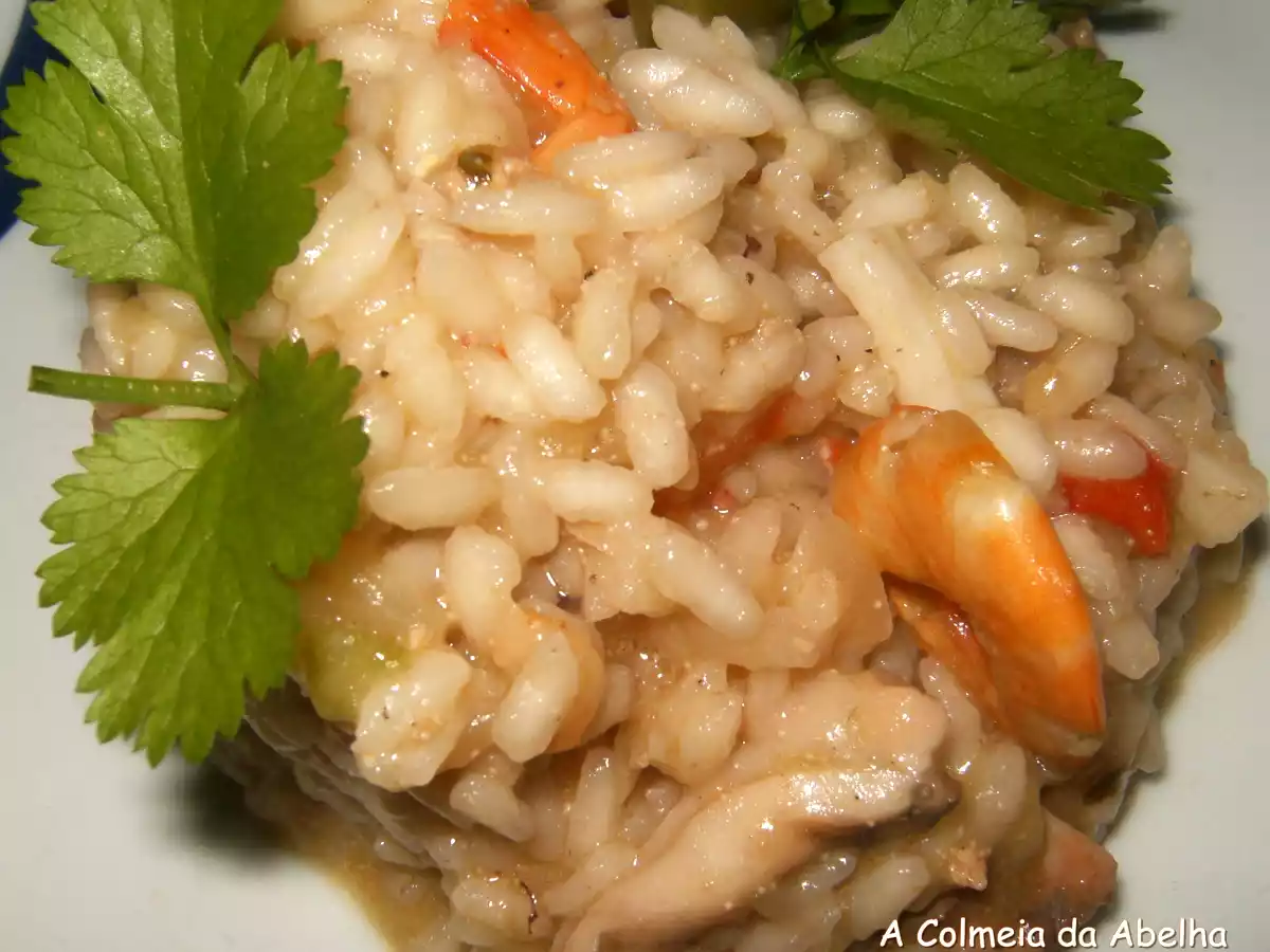Risotto de mariscada Prato PrincipalMédio30 min Enviar esta receita a um amigo Imprima esta página Falar com o autor da receita Fez esta receita? Compartilhe Ingredientes 3 225 gr risotto 1 pacote de mariscada 65 ml vinho branco 1 lt caldo ( usei natura de legumes) 1 colher bem cheia de sopa manteiga Azeite,q.b. 2 dentes de alho 1 cebola Queijo parmesão ralado