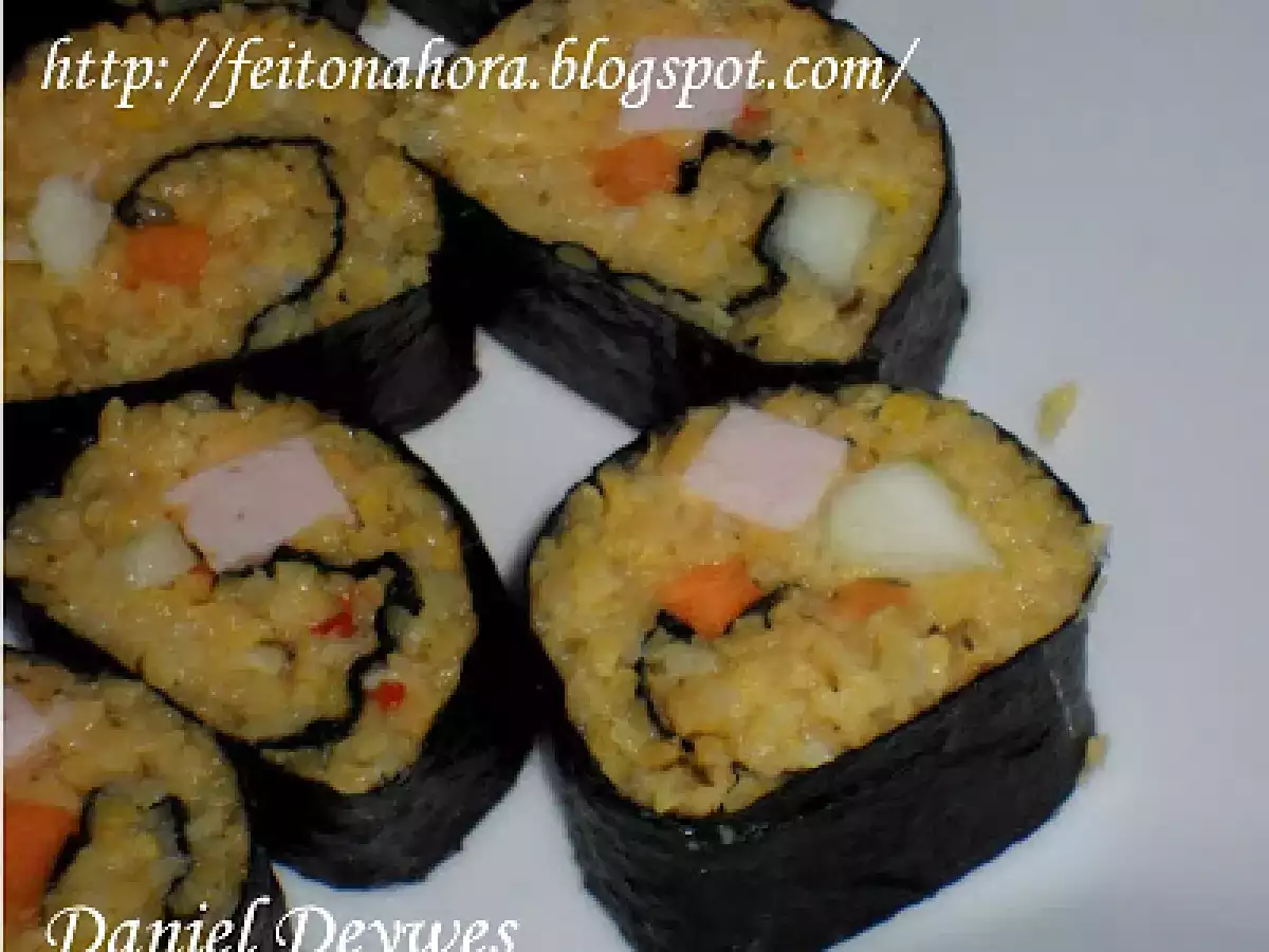 Sushi mineiro vote agora AnteriorNext Prato PrincipalMuito Fácil2 horas Enviar esta receita a um amigo Imprima esta página Falar com o autor da receita Fez esta receita? Compartilhe Ingredientes 4 1 xic de canjiquinha 1 xic de água 1 dente de alho picadinho 1 cebola picadinha sal a gosto Para o Sushi: 4 folhas de nori - algas 1 pepino cortado em tiras/palito 1 cenoura cortada em tiras/palito Peito de peru defumado / costelinha de porco defumada em tiras Canjiquinha