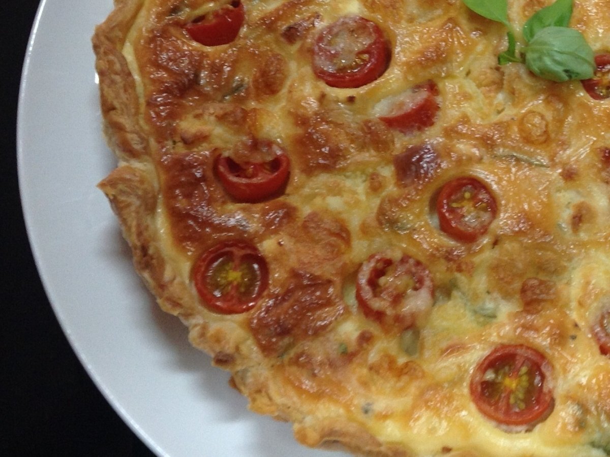 Tarte de queijo de cabra, tomate cereja e manjericão