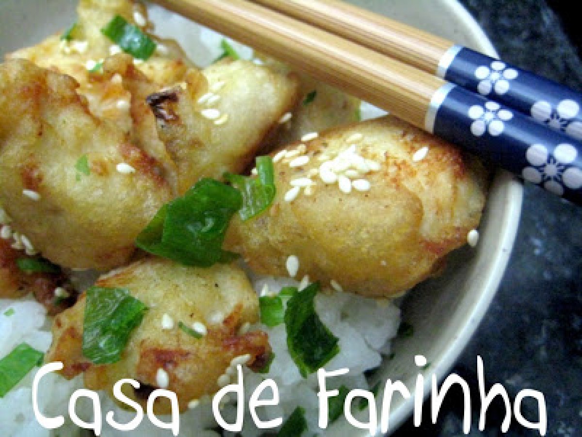 Tempura de frango Prato PrincipalMuito Fácil45 min Enviar esta receita a um amigo Imprima esta página Falar com o autor da receita Fez esta receita? Compartilhe Ingredientes 4 500 g filés de frango 2 xícaras de farinha de trigo 1 lata de cerveja gelada Cubos de gelo Sal e pimenta alho e cheiro verde a gosto Óleo para fritar Gergelim Tempero: 5 dentes de alho moído 2 colheres (sopa) de sal 1 colher (chá) de pimenta 3 ramos de salsinha e cebolinha