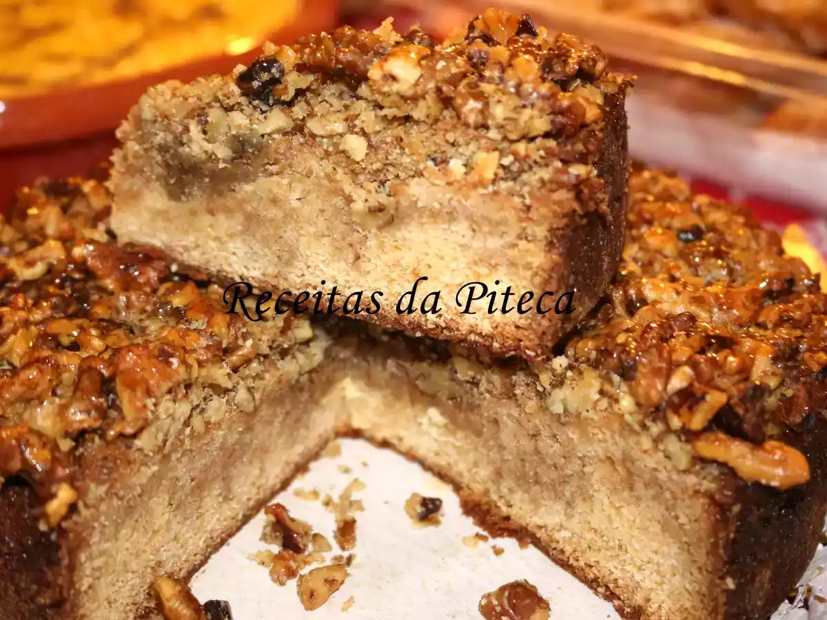 Fiz este bolo para a passagem de ano. A receita retirei do meu livro Cakes & Slices, mas fiz a dobrar, pois achei que ficaria um bolo muito pequeno. Fiz também umas alterações pois o que vem no livro leva amêndoas, mas eu, como não tinha amêndoas nem me apeteceu ir comprá-las, coloquei nozes e no fim de cozido pincelei com mel para dar brilho. Ficou excelente.
