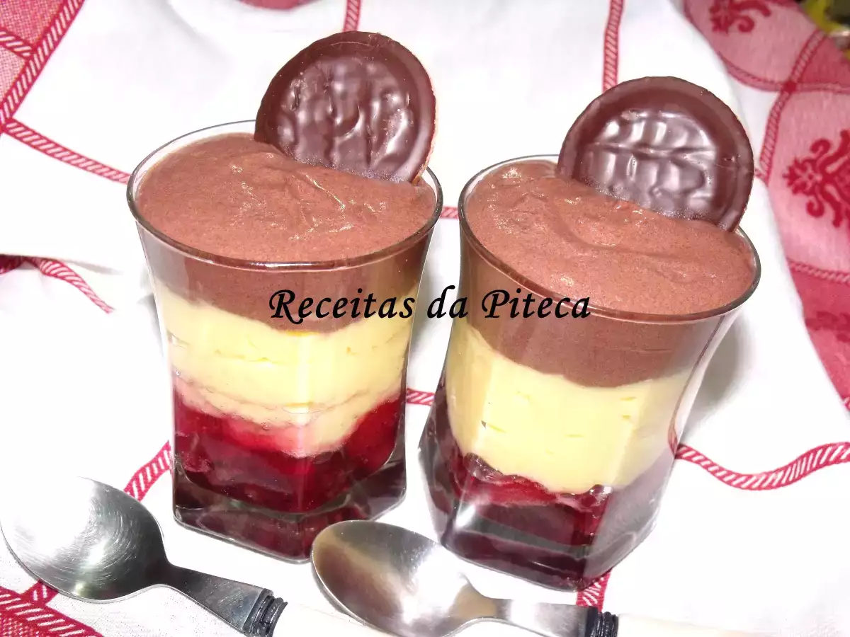 Delicia tricolor de bolacha recheada SobremesaMuito Fácil1 hora Enviar esta receita a um amigo Imprima esta página Falar com o autor da receita Fez esta receita? Compartilhe Ingredientes 6 Este docinho foi uma quase reprodução de um doce que o meu homem e a minha cunhada comeram num passeio que fizemos a Évora e adoraram. A diferença entre este e o que eles comeram lá é que este leva frutas e o outro levava apenas bolacha tipo maria picada. Mas vocês podem fazer como entenderem claro! Podem acreditar que de qualquer das maneiras o doce fica uma tentação!! Desta vez o autor foi o meu homem com uma pequena ajuda minha no creme de pasteleiro porque ele não o sabia fazer eh eh eh! Então ele fez assim: Ingredientes: 1 embalagem de mousse Creme de pasteleiro: 5 ovos 5 colheres (sopa) de açúcar 2 colheres (sopa) bem cheias de maisena 1 pitada de aroma de baunilha 0,5 l de leite Fruta: 250 gr de morangos 60 gr de amoras 60 gr de mirtilhos 3 colheres (sopa) de açúcar 20 gr de chocolate preto picado 18 bolachas recheadas sabor amora