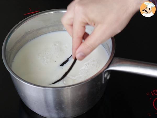 Colocar o leite a aquecer, juntando a vagem de baunilha partida em dois.