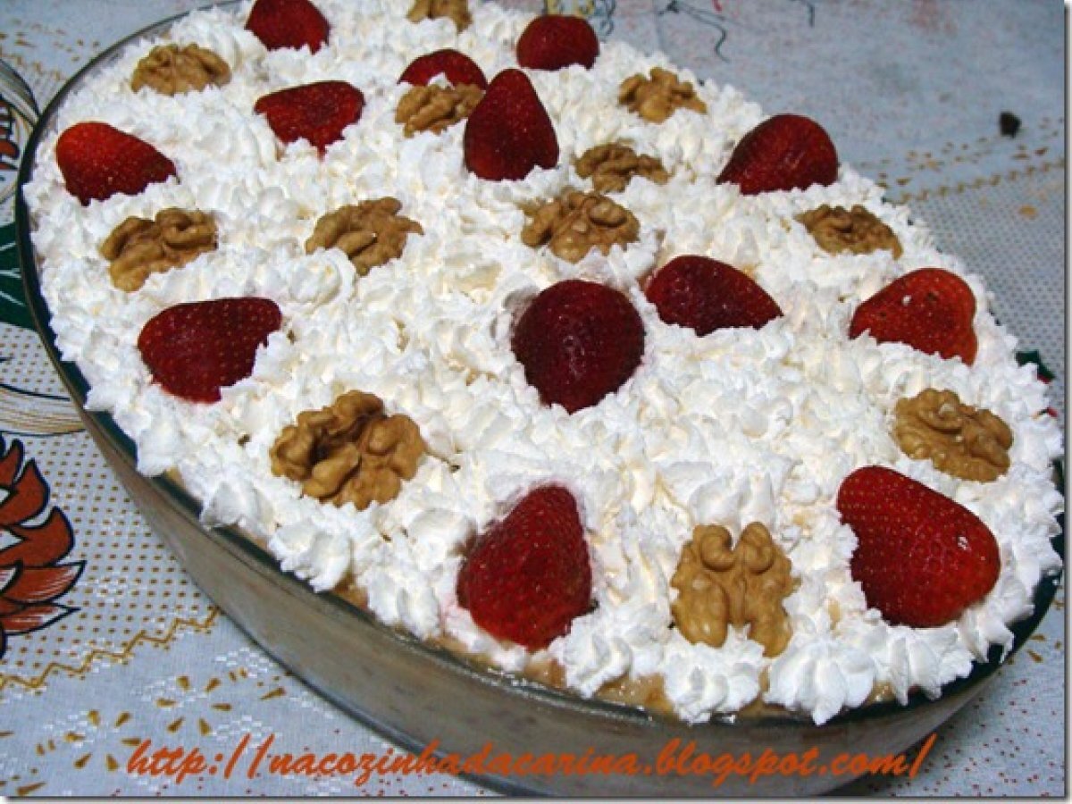 Pavê de nozes e morango vote agora SobremesaMuito Fácil30 min706 Kcal Enviar esta receita a um amigo Imprima esta página Falar com o autor da receita Fez esta receita? Compartilhe Ingredientes 8 1 receita de pão-de-ló 1 lata de guaraná antártica 250 g de nozes trituradas 1 caixa de morangos limpos 3 xícaras (chá) de chantilly 1 lata de leite condensado 2 gemas peneiradas 700 ml de leite 3 colheres (sopa) de maizena 2 colheres (café) de baunilha reserve algumas nozes e morangos para decorar