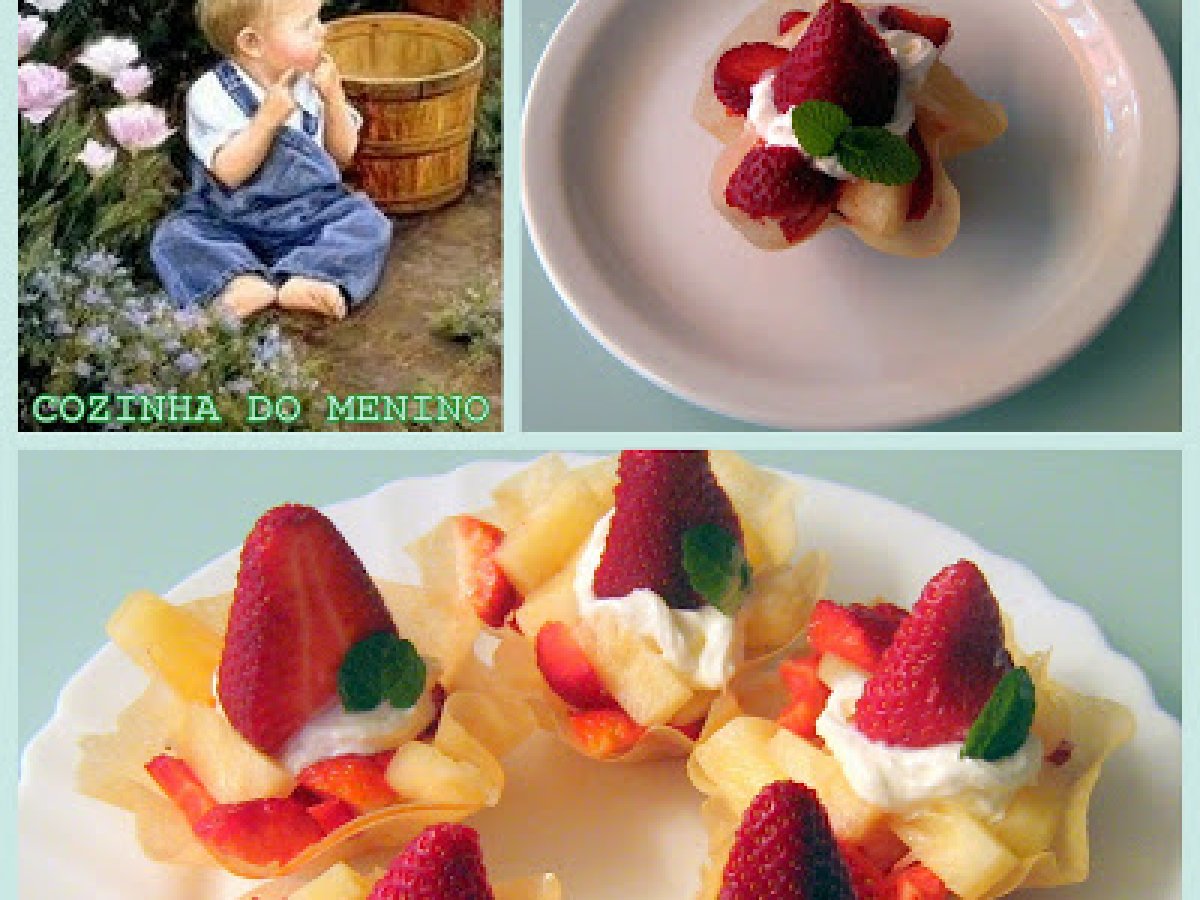 Taças de massa brick com fruta e chantilly SobremesaMuito Fácil20 min Enviar esta receita a um amigo Imprima esta página Falar com o autor da receita Fez esta receita? Compartilhe Ingredientes 6 6 folhas de massa brick 3 colheres (sopa) de óleo de amendoim 200 g de morangos 200 g de ananás raspa de 1 lima